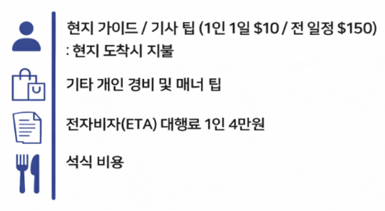 - 개인 상비약을 준비하고, 여행기간 중 개인위생 및 건강에 유의합니다.