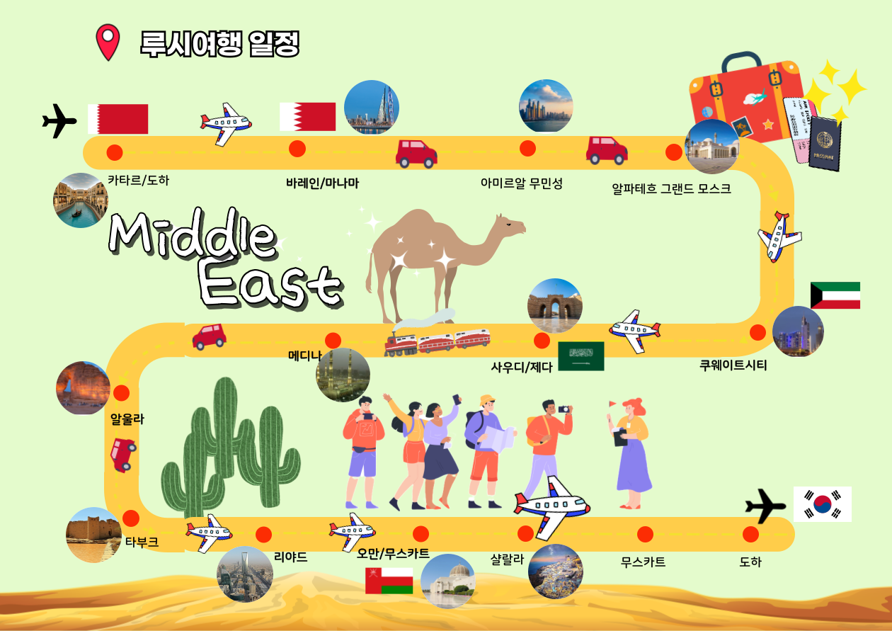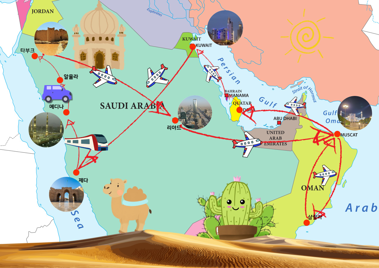 중동 5개국 ‘아라비아’ 일주 14일 (단독 행사, 소그룹) 맞춤여행 여행기간 : 2026년 01월10일 ~ 2026월 01월23일(14일간) 여행지역: GCC(카타르, 바레인, 사우디, 쿠웨이트, 오만) 5개국