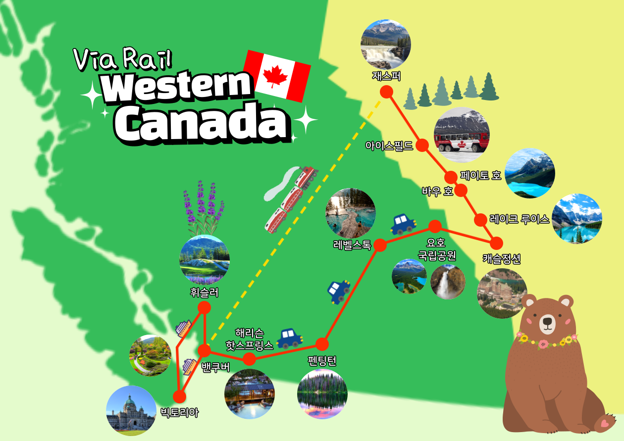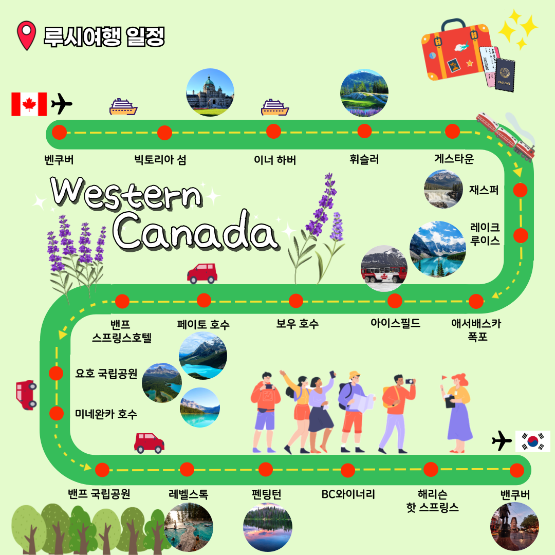 밴쿠버에서 시작하여 빅토리아 섬과 아름다운 캐나다 서부 로키 산맥을 돌아보며 대표적으로 재스퍼, 호, 밴프 국립공원을 방문합니다.