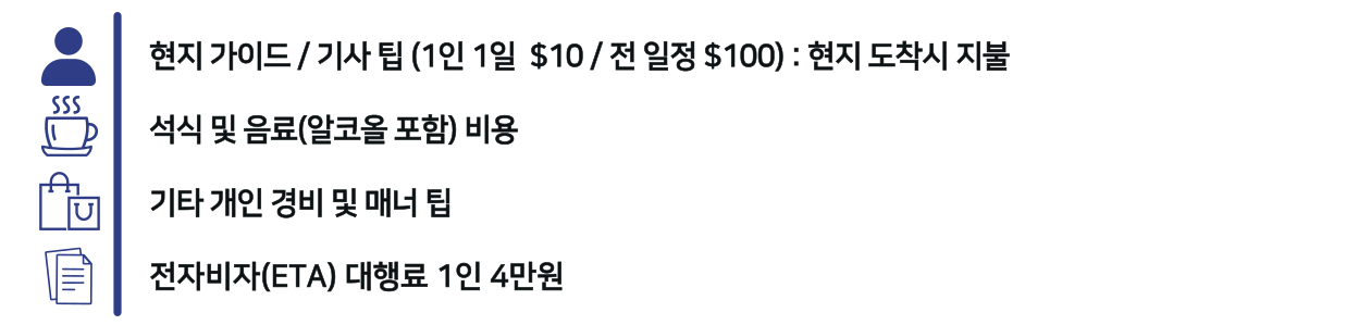 - 개인 상비약을 준비하고, 여행기간 중 개인위생 및 건강에 유의합니다.